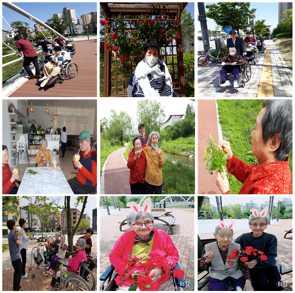 하루는 휠체어를 끌고 미세 먼지에 대비해 단단히 무장을 했지만 햇볕은 따뜻해서 움직임이 없는 어르신들은 너무 좋아하셨어요~오랫만에 바깥 나들이라 붉은 장미며 하천에 물고기며 정말 기분 전환 확실히 되는 날이였어요... 어르신들이 모두 오래살고 볼일이라며 즐겁고 만족스런 산책이였다고 하셨어요...^^