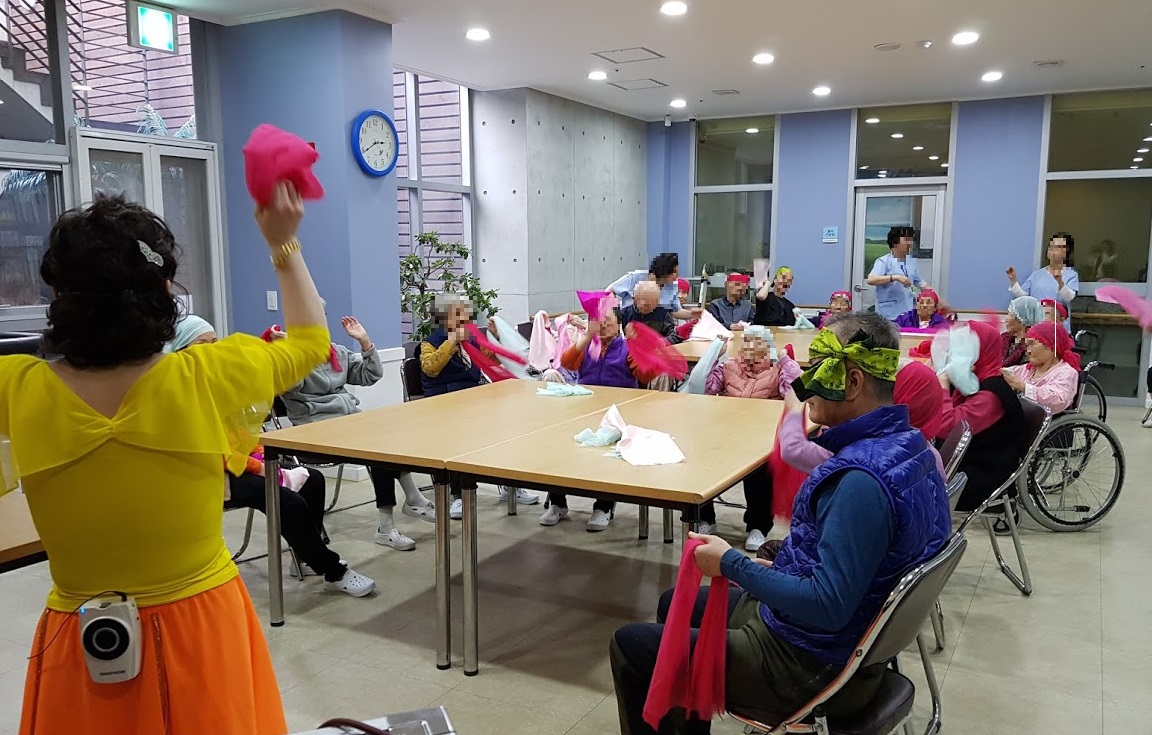 색깔 천을 머리에 두건처럼 쓰시고 열심히 강사님을 따라 율동을 해주시는 어르신들~
