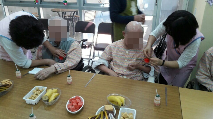 어버이날을 맞이하여 많은 어르신들을 모시고 다과를 베풀고 꽃을 달아드렸습니다.