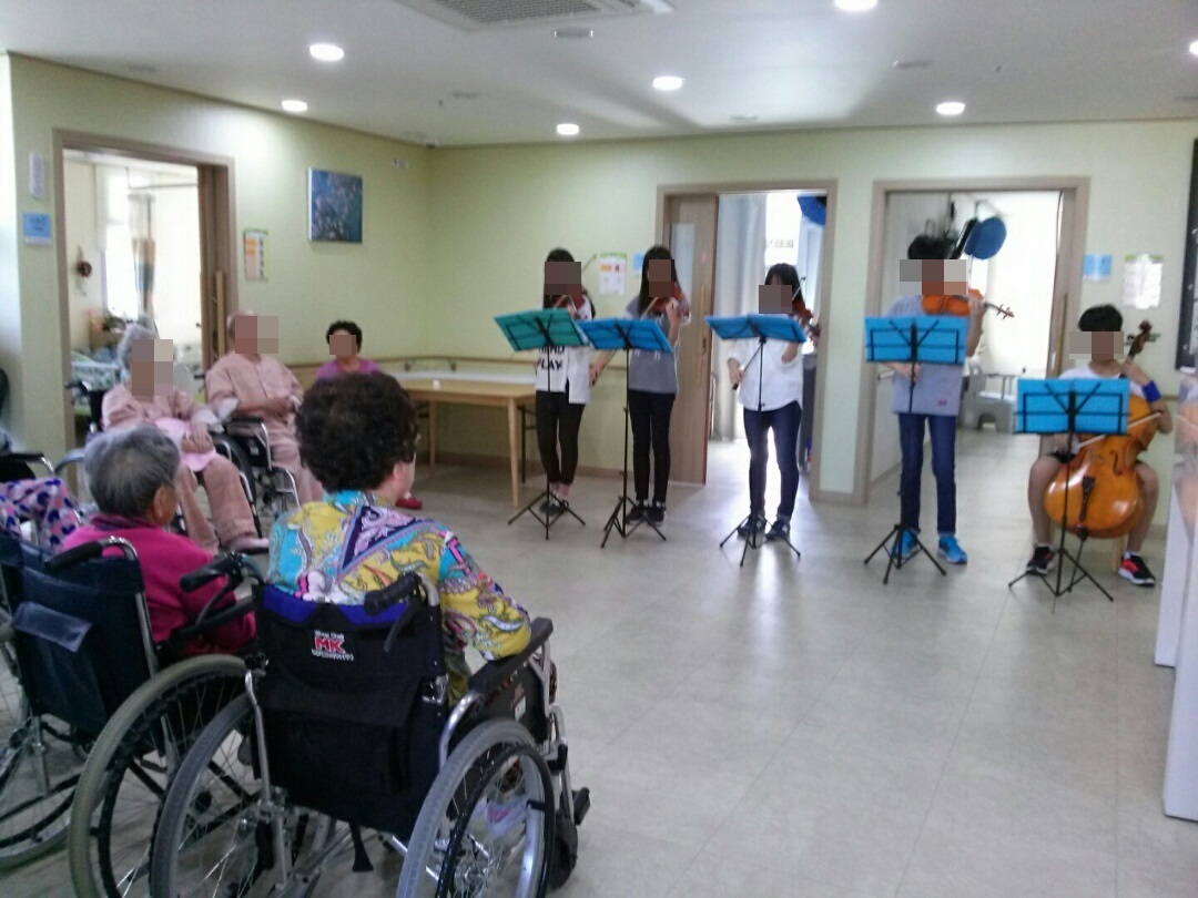 바이올린 연주모임인 중학생들의 악기 연주회가 있었습니다. 어르신들이 좋아하시는 음악을 바이올린과 첼로로 연주하니 매우 색다른