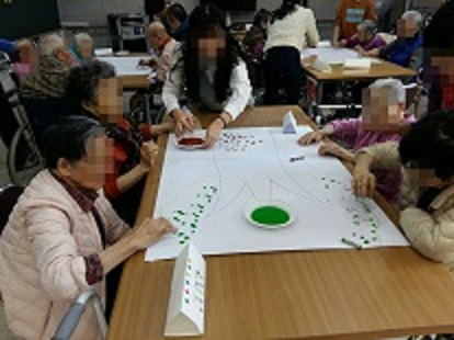 어르신들이  예전의 어린시절로 돌아가  손바닥에 물감을 묻히고  도화지에  찍어보며  학창시절을 되새겨보았습니다.