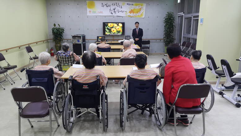 오늘은 어르신들께서 찬송가를 4절까지 따라하셨고 나눠드린 찬송가를 생활실에가져가셔서 벽에 붙이시는 어르신들도 보이셨고
